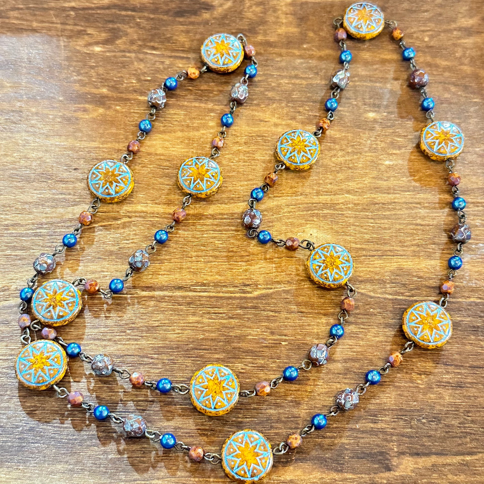 Handcrafted fall sun boho necklace, celebrating autumn warmth and change. Artisan jewelry gift for weddings, birthdays & anniversaries.
