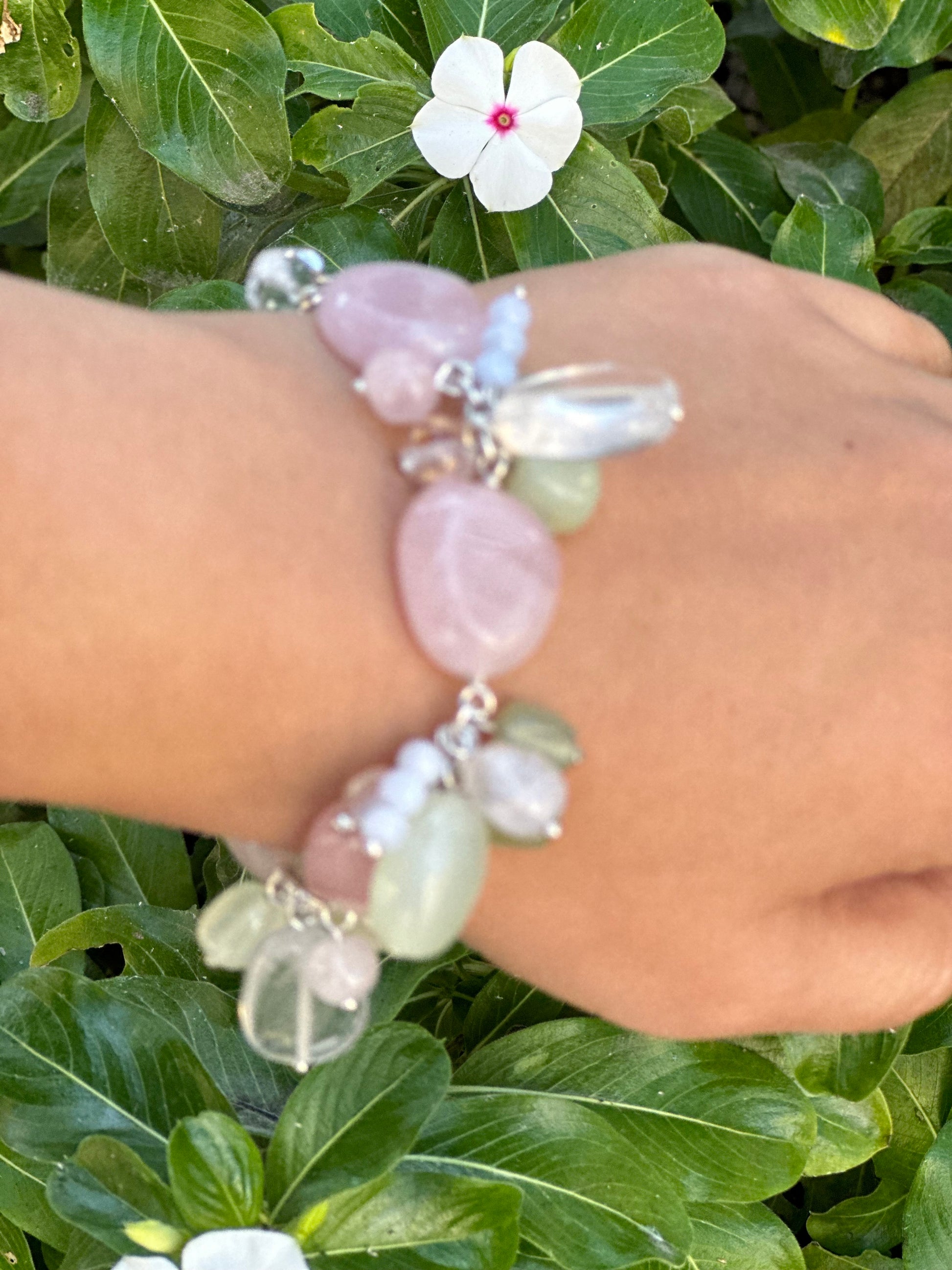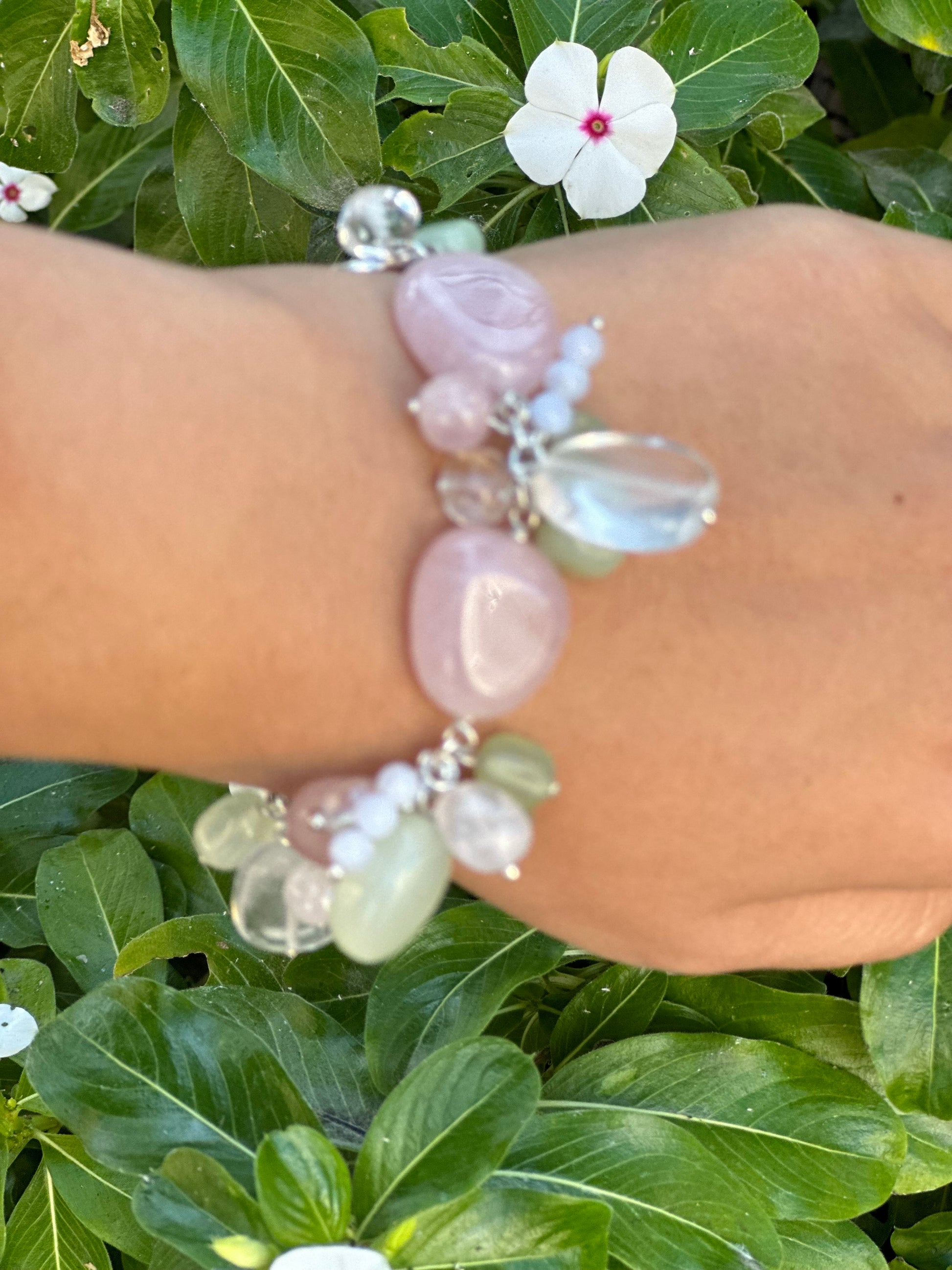 Artisan rose quartz sterling bracelet, celebrated as the stone of love. Handcrafted jewelry gift for weddings, anniversaries & Valentine’s Day.