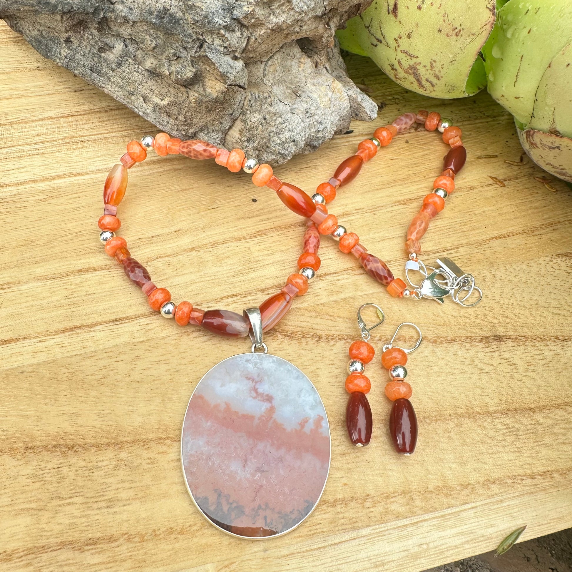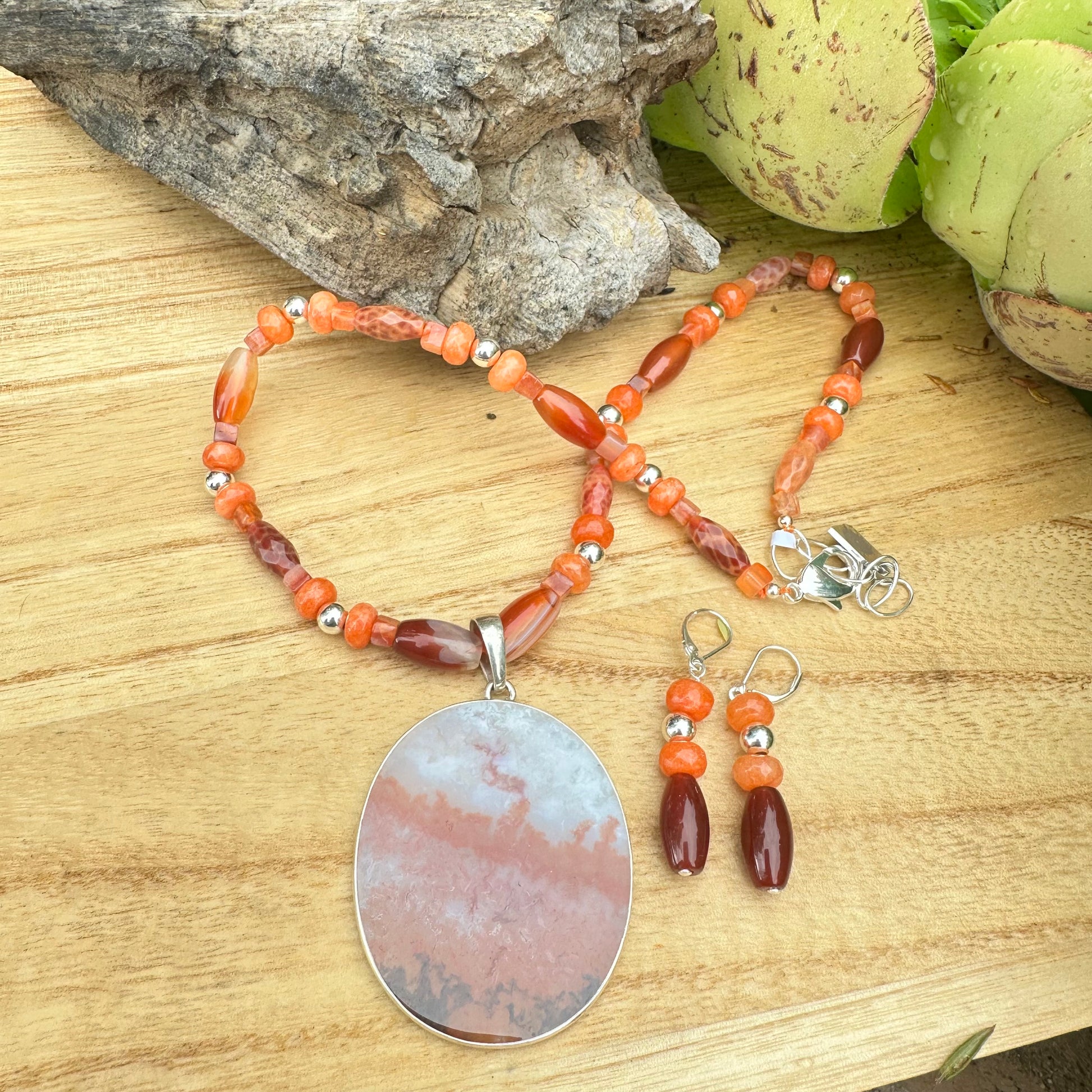 Handcrafted carnelian & dendritic agate pendant necklace, symbolizing courage and grounding. Artisan gift for weddings, birthdays & meaningful occasions.