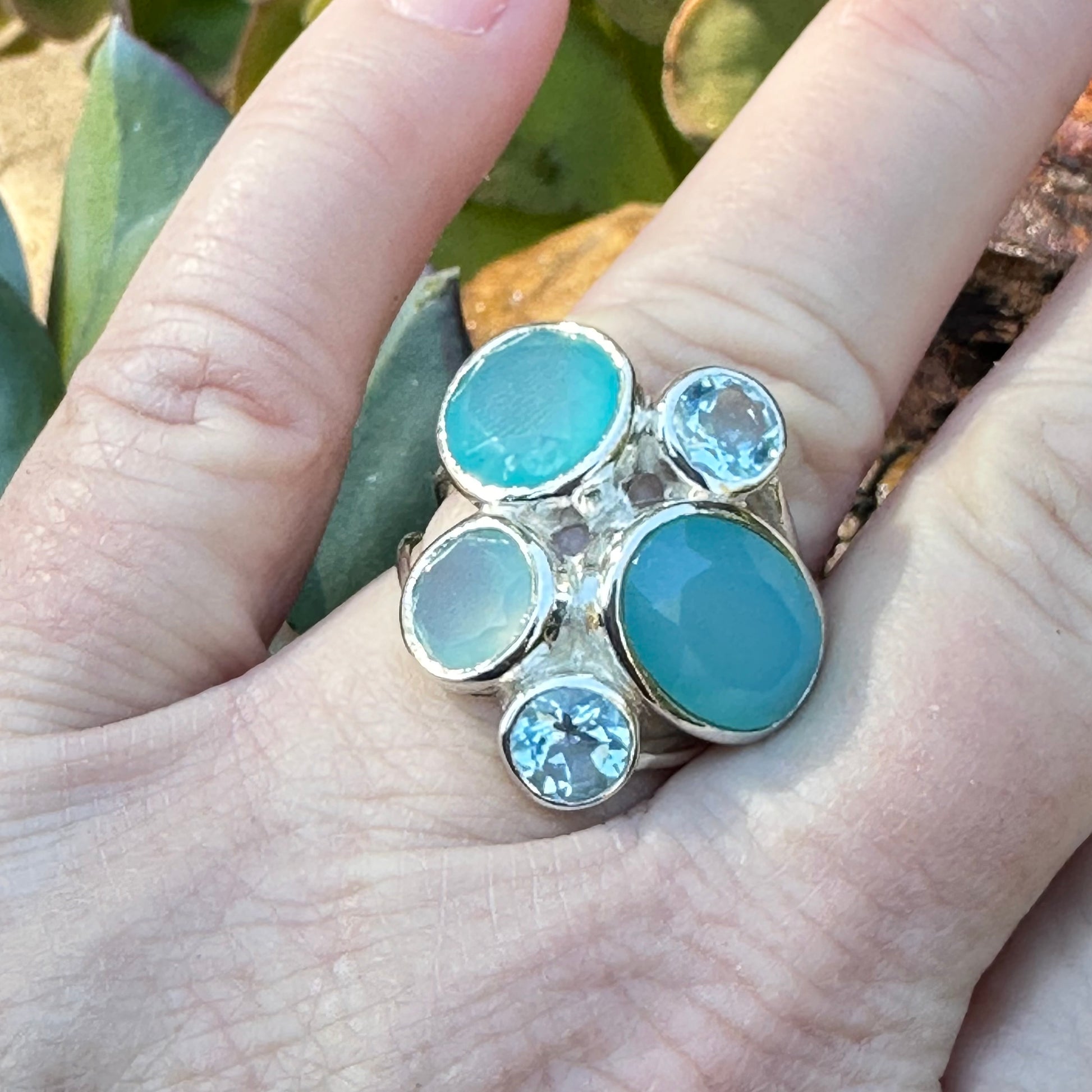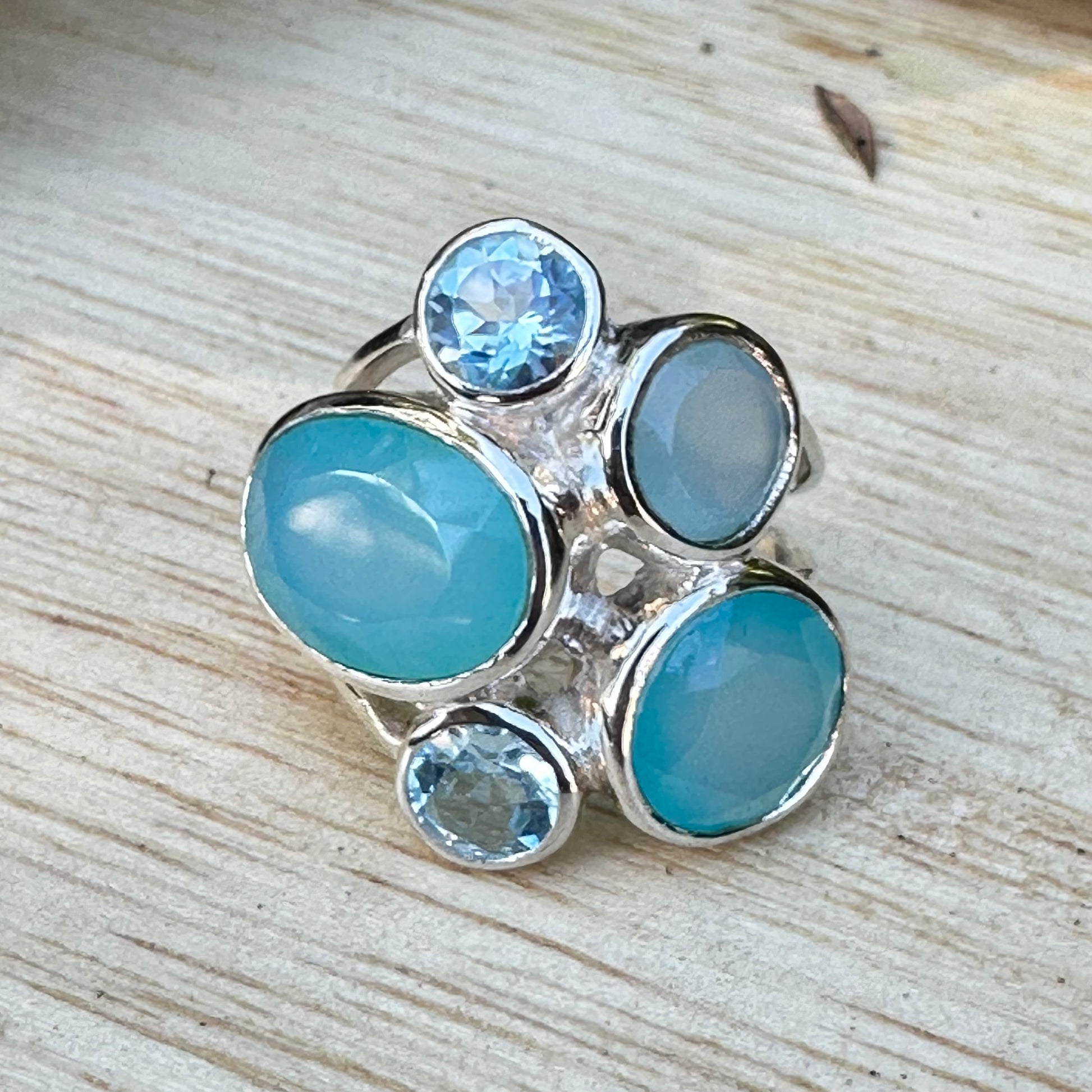 Authentic chalcedony & topaz sterling silver ring, symbolizing clarity and balance. Handcrafted artisan gift for weddings, anniversaries & birthdays.