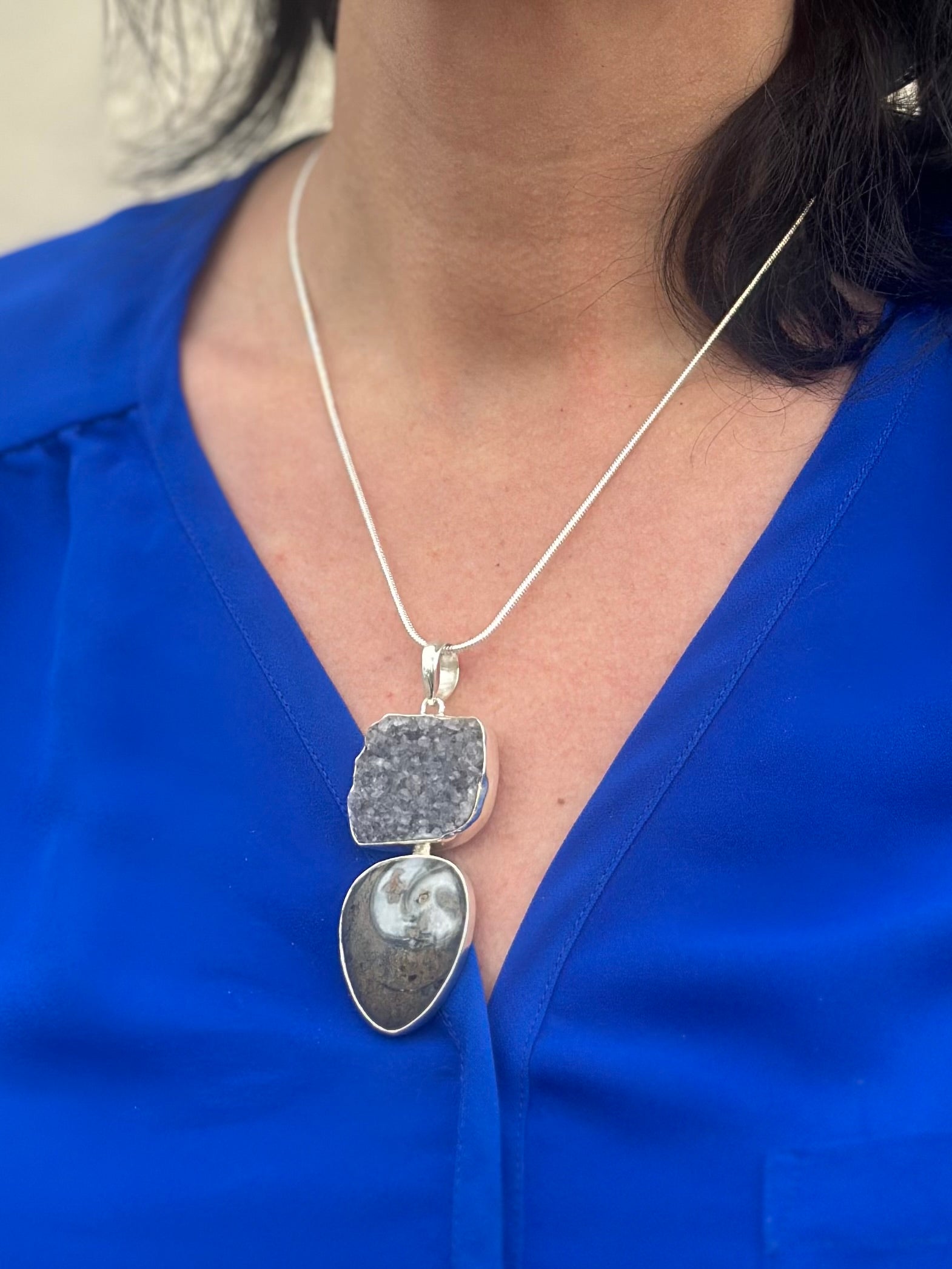 Colossus fossil stone, Druzy, and Sterling Silver Pendant on 18" Sterling Silver Chain
