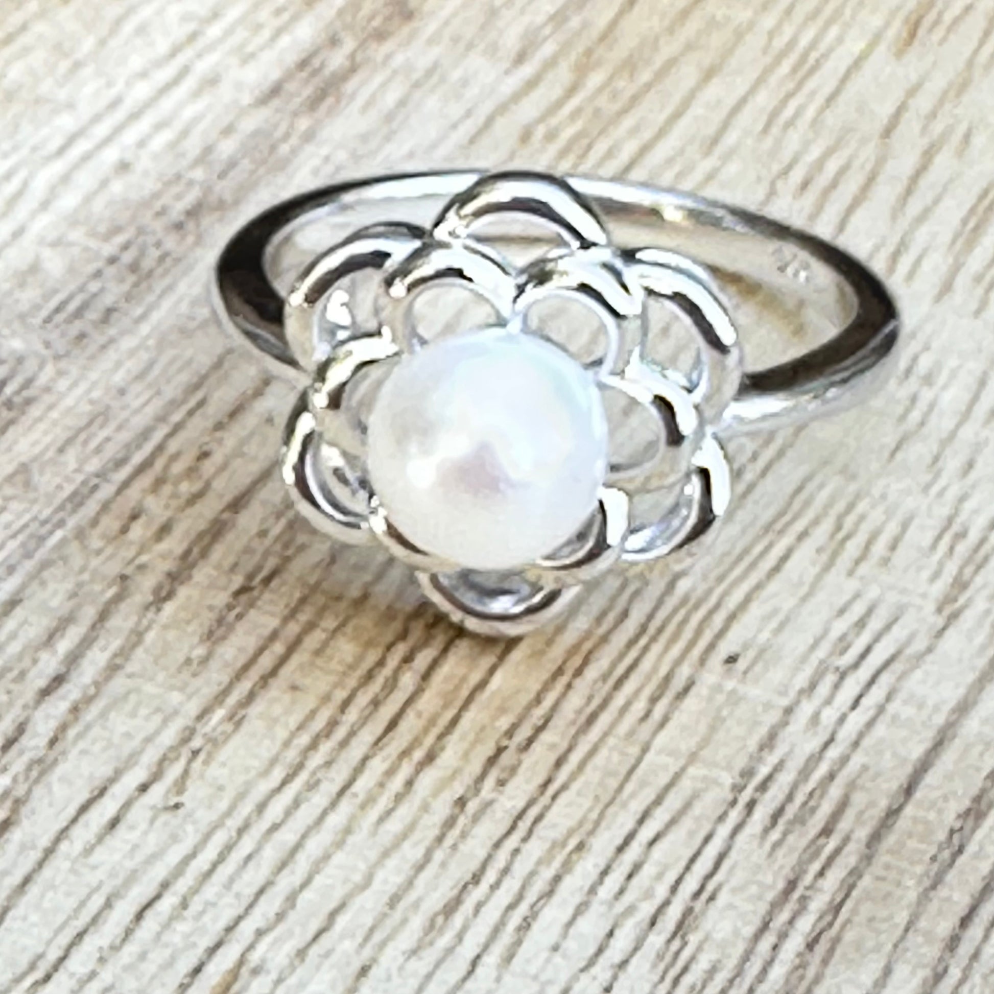 Handcrafted daisy pearl sterling ring, symbol of purity and joy. Authentic artisan gift for weddings, birthdays & anniversaries.