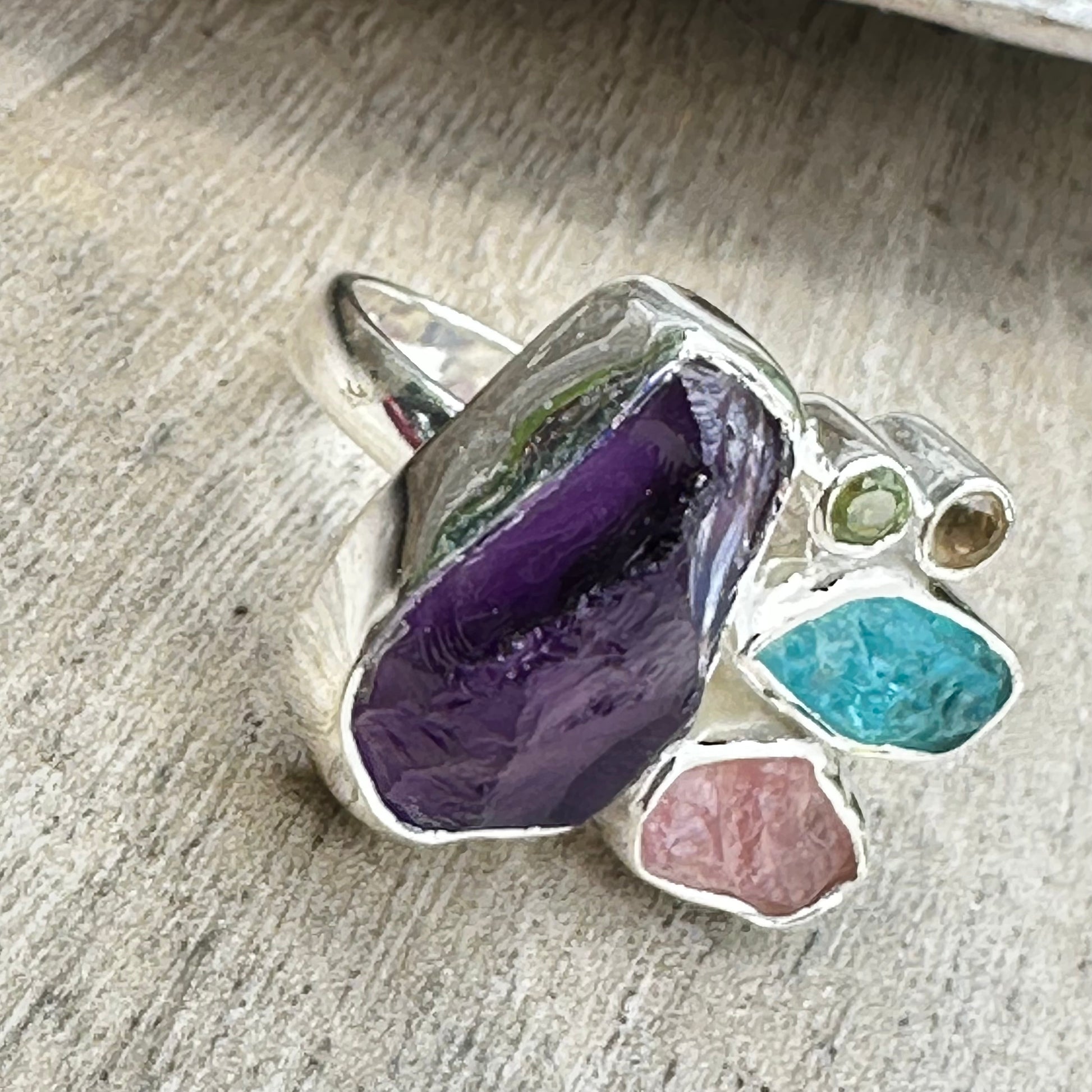 Rough Amethyst, Rough Peridot, Rough Citrine, Rough Rose Quartz, Rough Apatite sterling silver ring