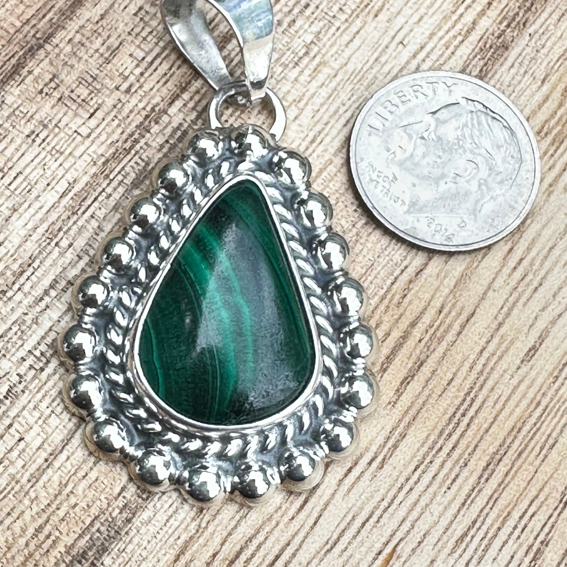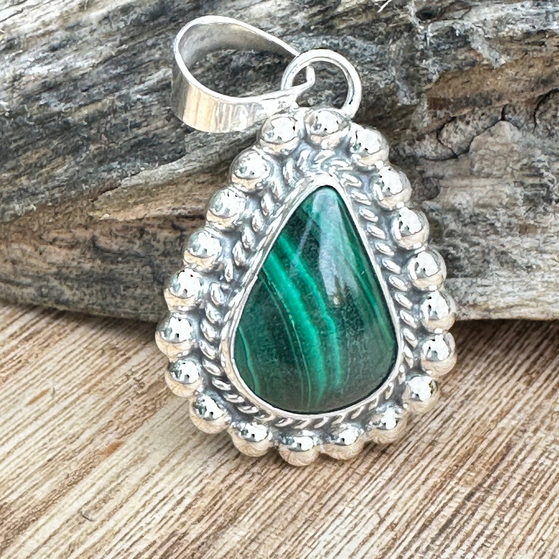 Beautiful malachite wrapped in sterling silver pendant with 18" sterling silver chain